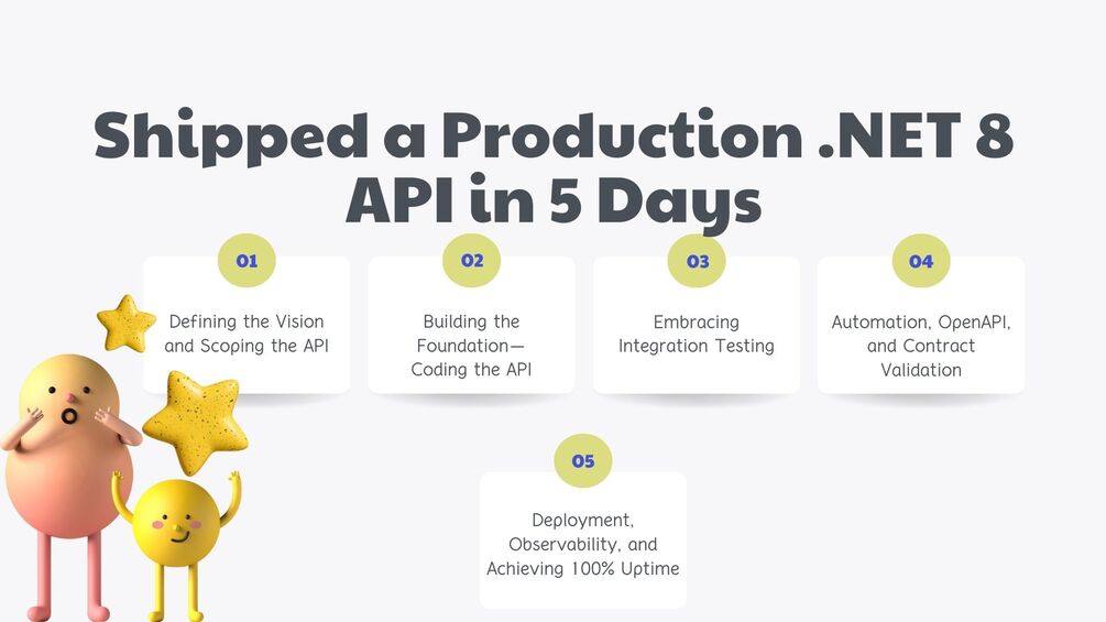 The ultimate guide to shipping production-ready .NET 8 APIs fast - 5-day blueprint with integration testing, OpenAPI contracts, and 100% uptime without unit tests!